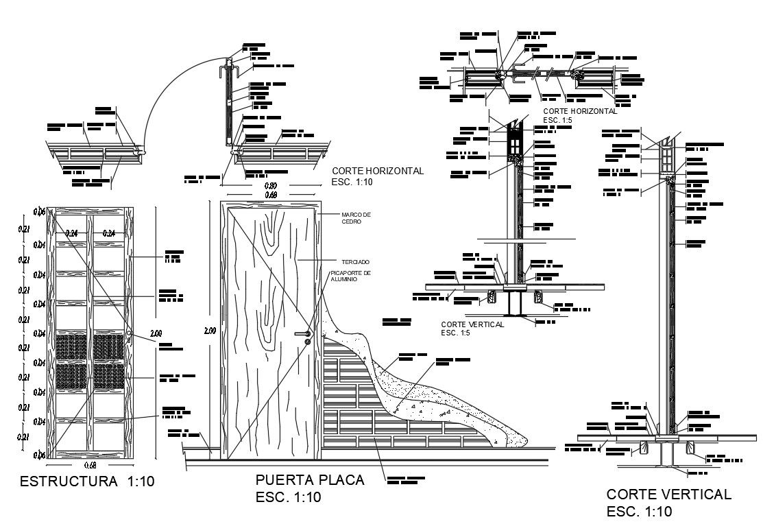 Door Section Detail In DWG File which shows wood chip, wooden frame, vertical pine, pine frame, cover, revoke fine, revoke thick, tirafondo metal.