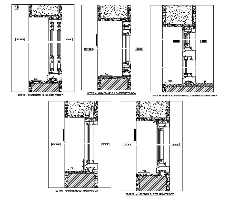 Download Free Window Detail In DWG File which shows different types of windows drawings, It also includes inside and outside details with section details.