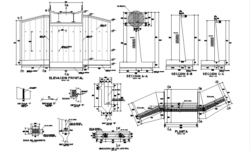 Leveling retaining wall section plan, section line detail, dimension detail, naming detail, hatching detail, reinforcement detail, bolt nut detail, section A-A’ detail, section B-B’ detail, section C-C’ detail, etc.