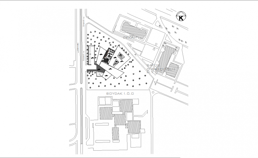 Kinder garten site location plan, hatching detail, north direction detail, landscaping detail in tree and plant detail, car parking detail, hatching detail, etc.