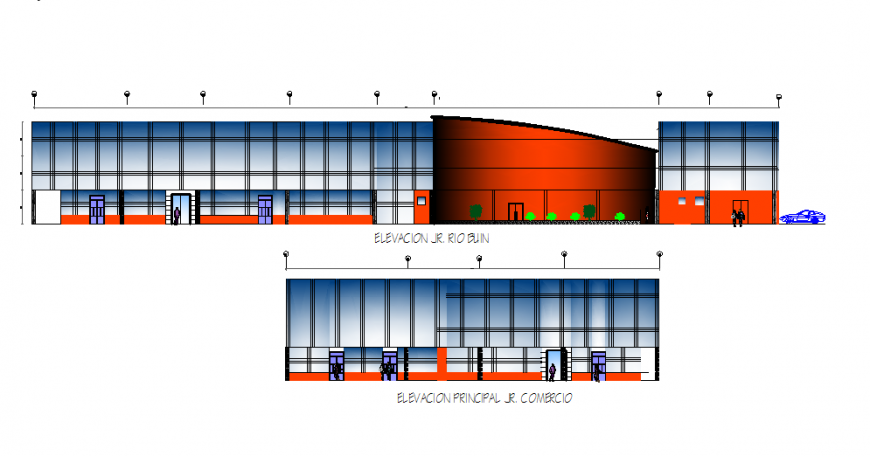 Elevation cultural center autocad file, front elevation detail, side elevation detail, centre lien detail, furniture detail in door and window detail, landscaping detail in tree and plant detail, dimension detail, naming detail, etc.