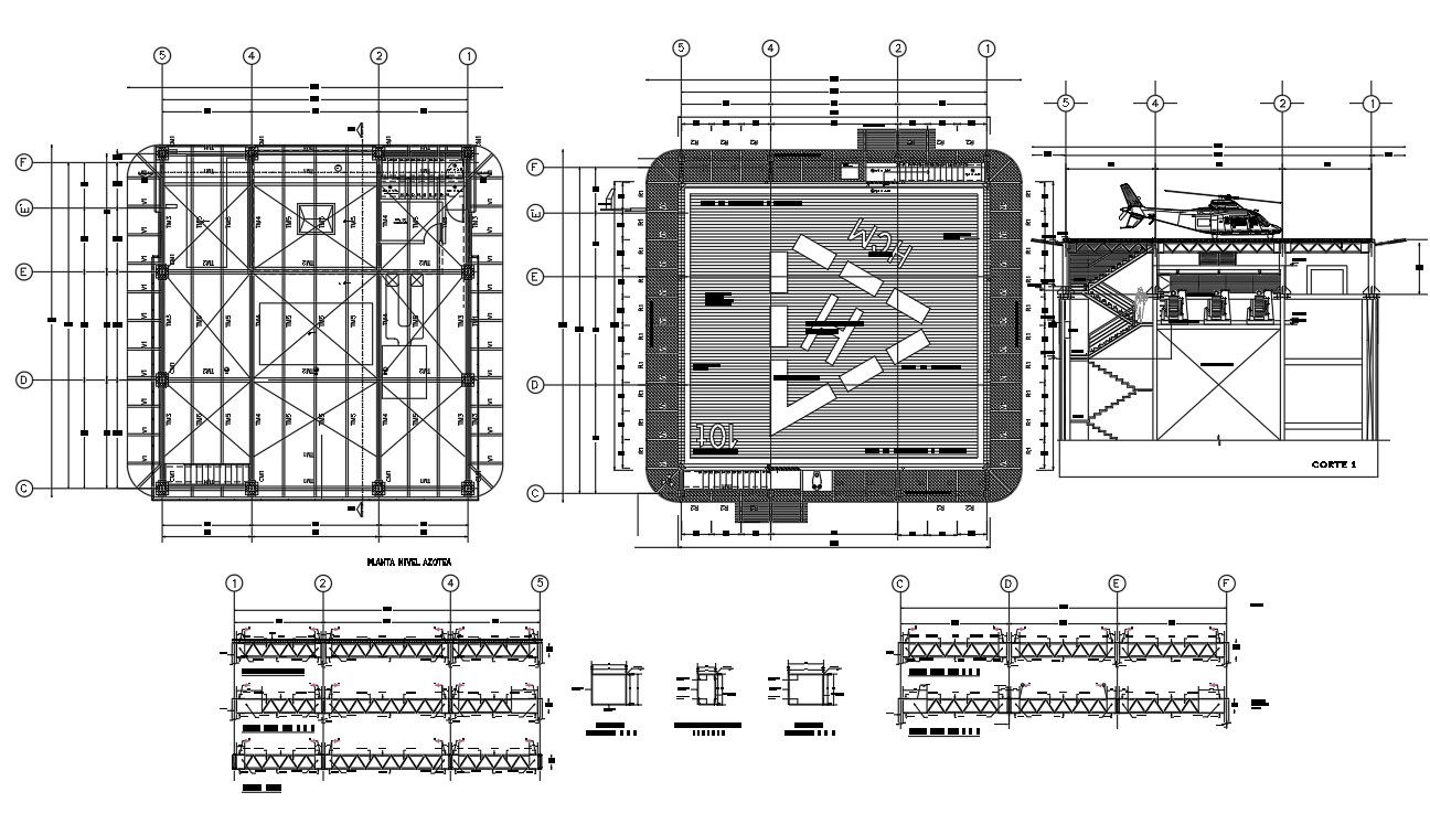 Helicopter Station In DWG File which shows platform plan of the helicopter, landing and departure area, area limit of contact, access, weight limit, column plan with detail dimension.