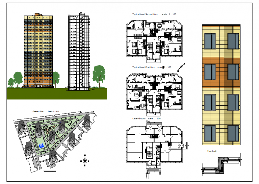 Residential Apartment Building project detail, Typical ground to second floor Detail, Parking lay-out, High Rise Building Elevation detail, Section cutting detail.