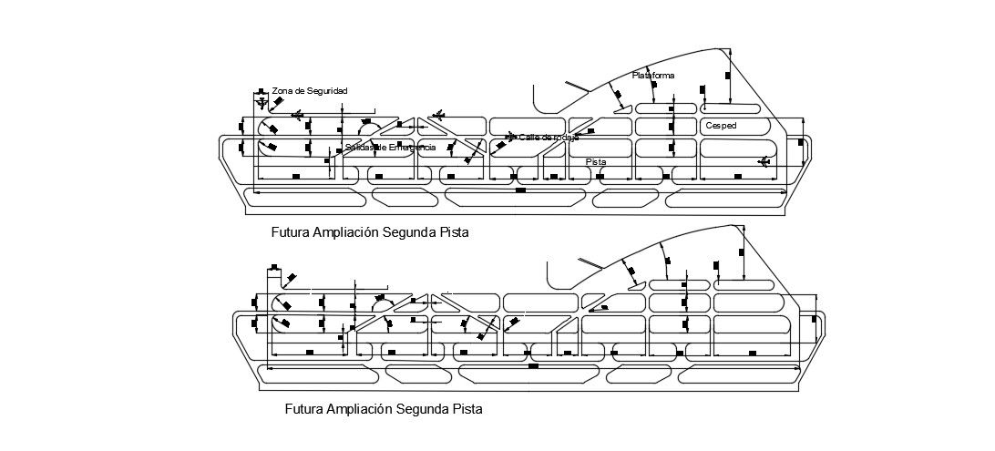 Download Free Airport Runway Plan In DWG File which shows Second Runway, Security zone, Emergency exits, Taxiway, Grass, Platform.