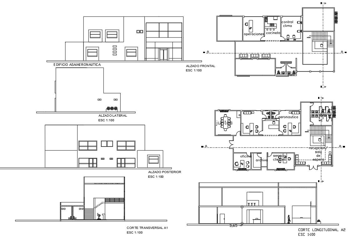 Office Building Elevation In AutoCAD File which shows different elevations of the aeronautical building, It also includes operations, control weather, kitchen, office, waiting room, service customers, meeting room.