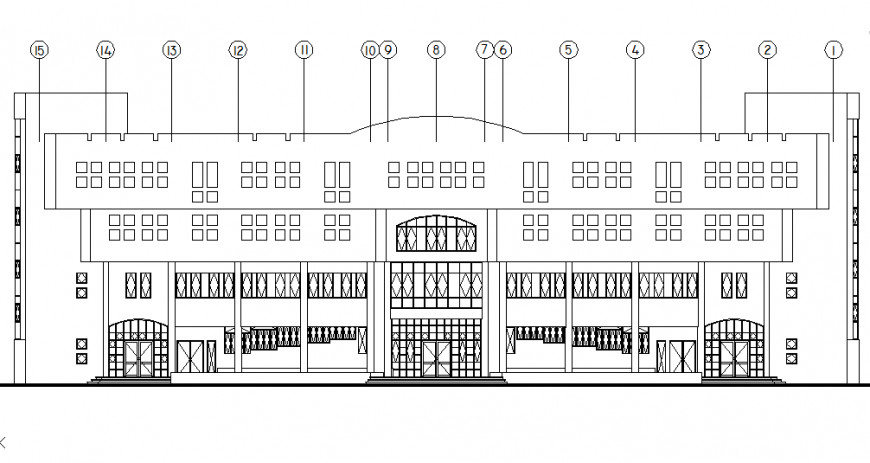 Main gate commercial building plan, centre line detail, furniture detail in door and window detail, vent detail, hatching detail, stair detail, hidden line detail, etc.
