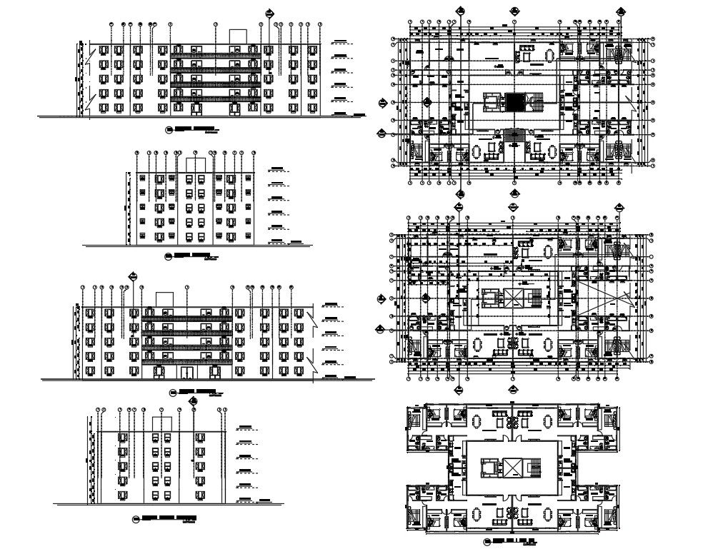 Apartment Building Plan In DWG File which shows different elevations and sections of the building, It includes a plan of the hall, kitchen, dining room, bedrooms.