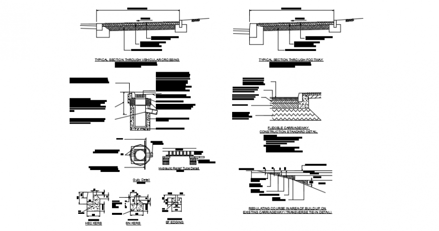 Highway standard road construction details,sectional details with text detailing, sectional details with measurement and text is shown