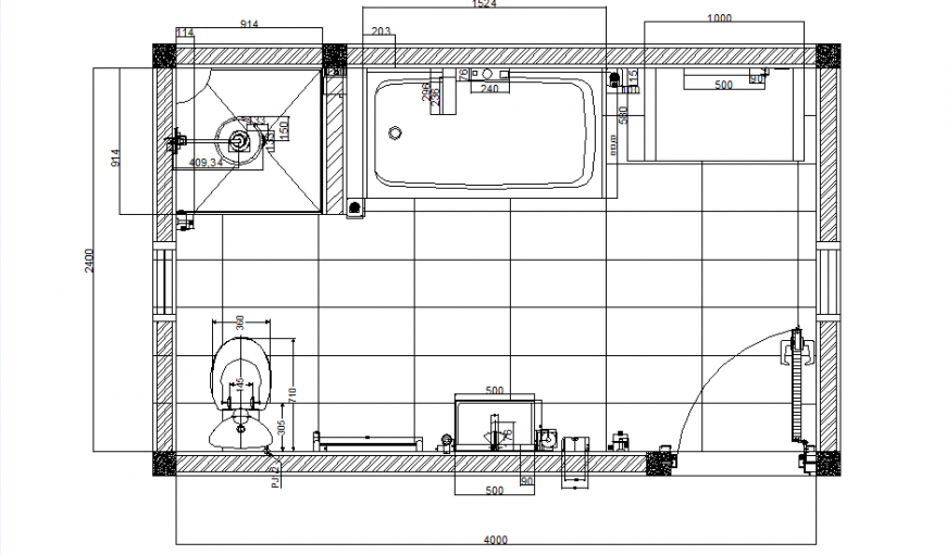 Bathroom plan layout file, dimension detail, naming detail, hatching detail, cut out detail, furniture detail in door and window detail, bath tub detail, shower detail, water closed detail, tiles detail, anty detail, etc.