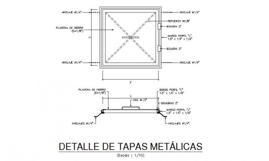 Detail of metal covers autocad file, dimension detail, naming detail, hidden line detail, plan and section detail, scale 1:10 detail, etc.
