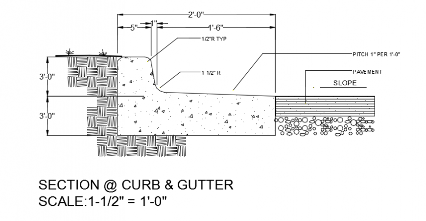 Highways curb and gutter sectional detailing ,depth sectional detailing, top view of a layout is shown , construction detail in auto cad format