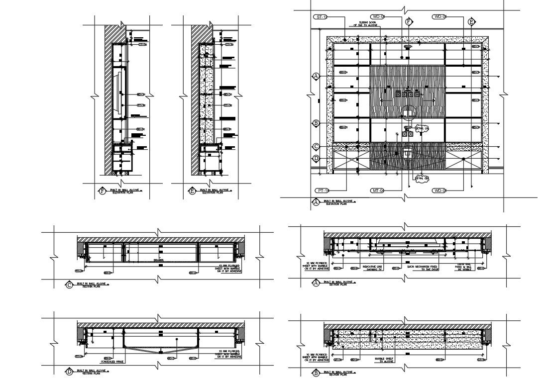 Wall Alcove In DWG File which shows details of 10 mm plywood Sheet with marble adhesive. Marble Shelf to cover, Wooden Frame Section Detail.