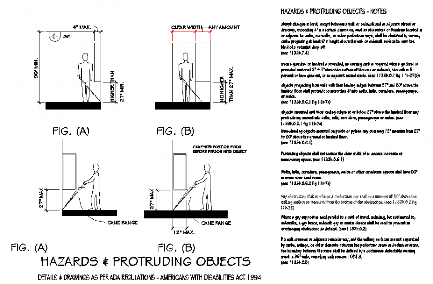 Hazards & protruding objects detail. Protruding objects shall not reduce the clear width of an accessible route or maneuvering space.Walks, halls, corridors, passageways, aisles or other circulation spaces shall have 80" minimum clear head room.