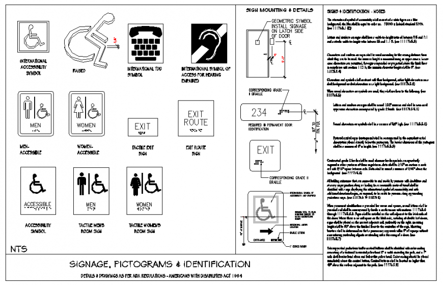 Sign mounting & Block details , international symbol of access for hearing empaired, international accessibility symbol, tactile men's room sign, tactile women's room sign etc.