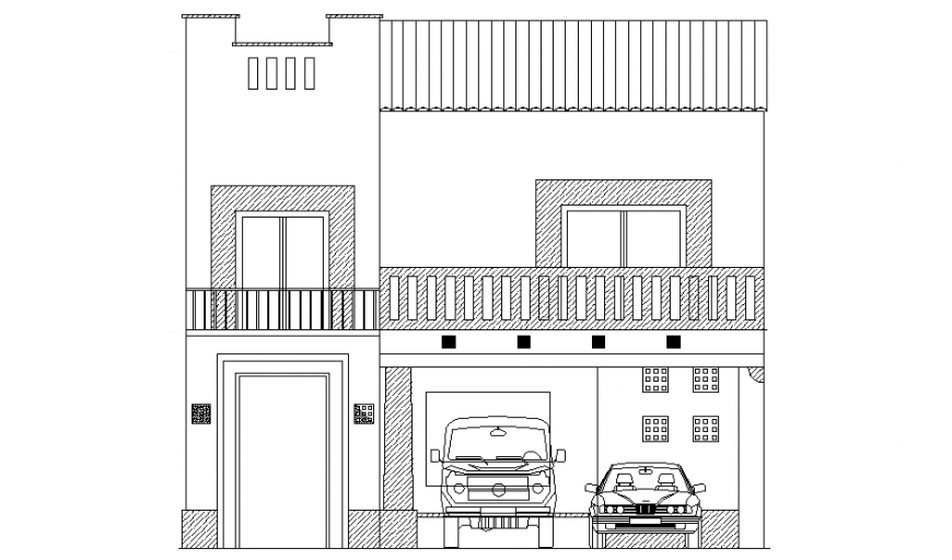 A Elevation house plan autocad file, hatching detail, furniture detail in door and window detail, balcony in reeling detail, etc.