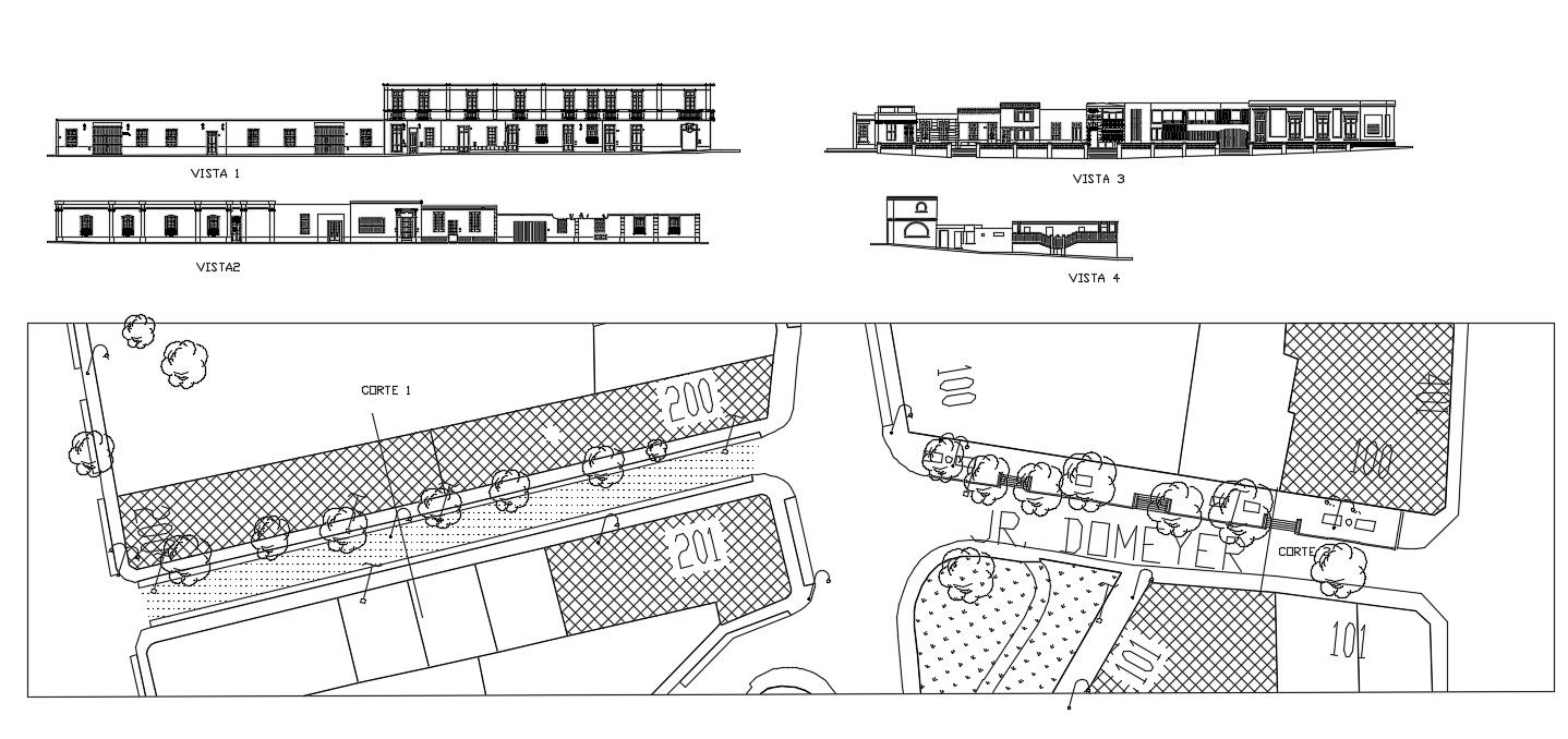University Site Plan In DWG File which shows different elevations of buildings, It also includes a site plan of the university.