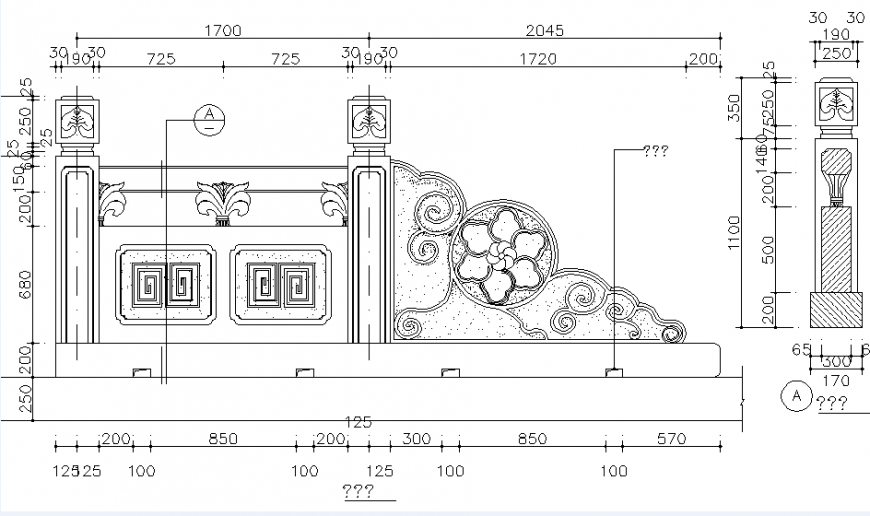 Aluminum railing cad detail, dimension detail, plan and section detail, naming detail, arc detail, flower detail, section line detail, column detail, front elevation detail, section A-A’ detail, concrete mortar detail, etc.