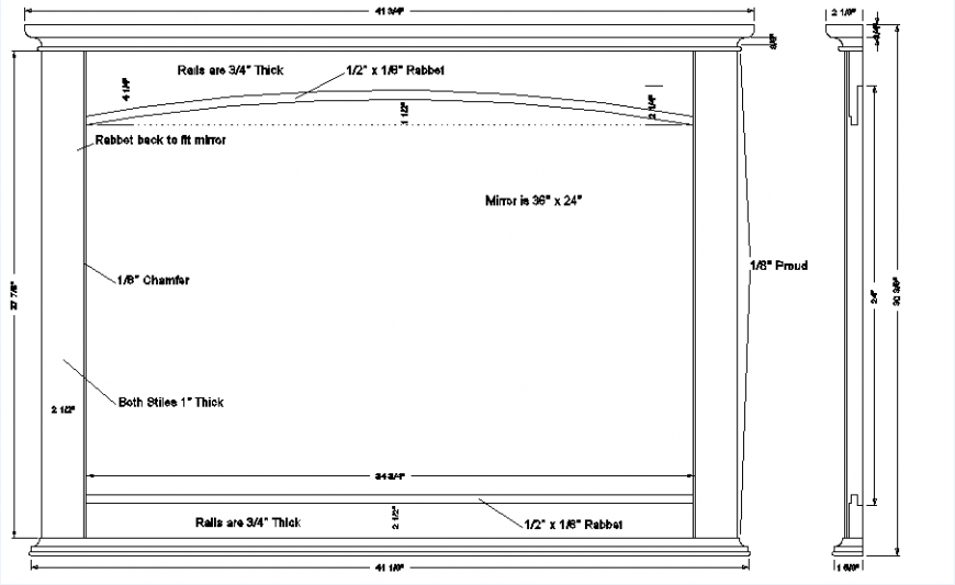 Mirror frame design autocad file, plan and section detail, dimension detail, naming detail, reinforcement detail, naming detail, etc.