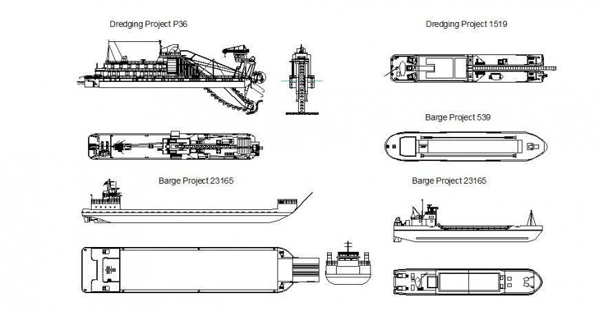 Dredging and barges autocad file, top view detail, front elevation detail, small house detail, ship detail, etc.