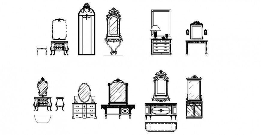 Dressers with mirrors layout file, different shape of dresser with mirror detail, cub board and drawer detail, etc.