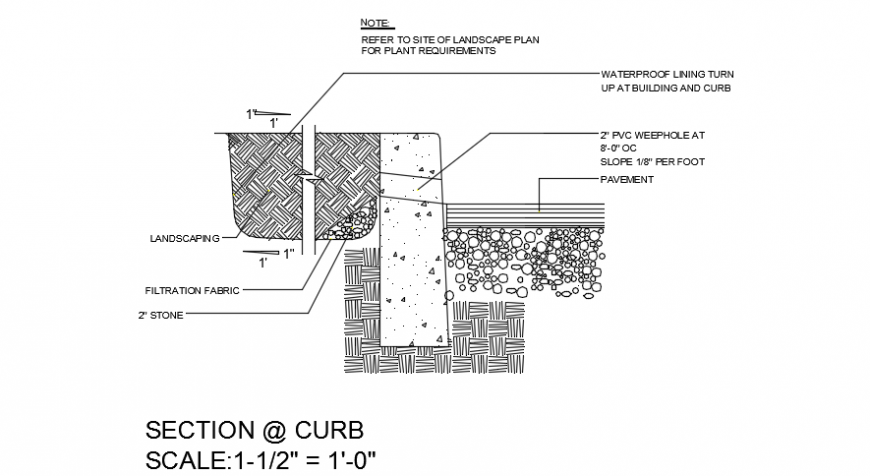 Curb sectional detail plan file,depth sectional detailing, top view of a layout is shown , construction detail in auto cad format