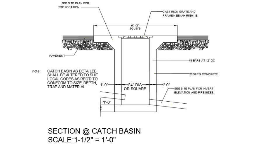 Highways catch basin section detail,sectional details with text detailing, sectional details with measurement and text is shown
