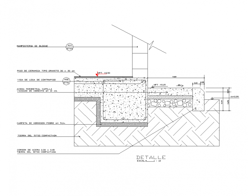 Detail perimeter side walk layout file, scale 1:10 detail, dimension detail, naming detail, concrete mortar detail, soil detail, leveling detail, stone detail, reinforcement detail, bolt nut detail, etc.