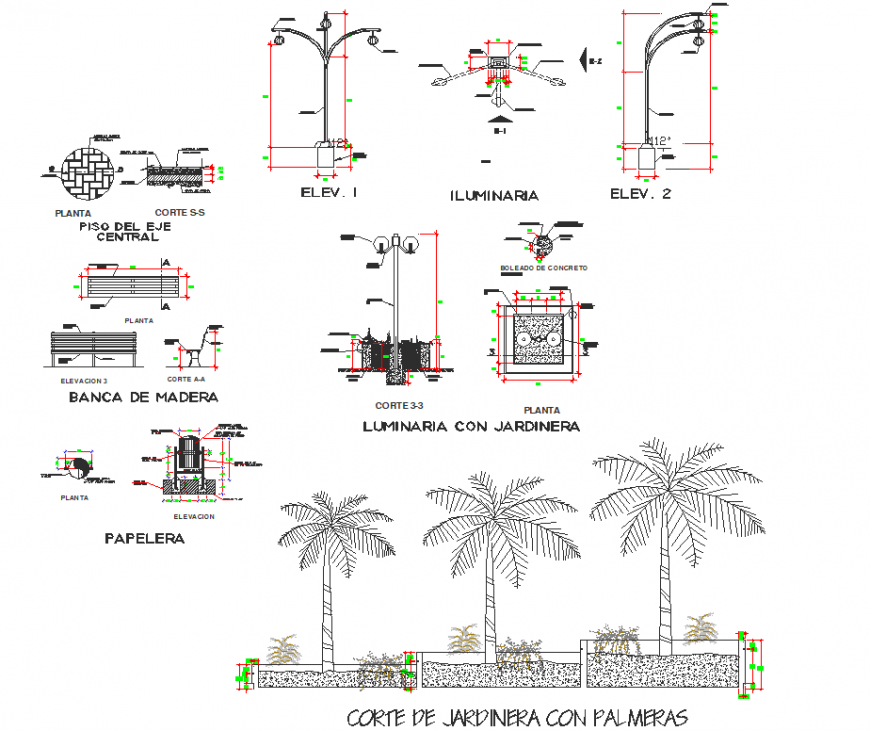 Street light section plan autocad file, landscaping detail in tree and plant detail, dimension detail, naming detail, hatching detail, street light detail, concrete mortar detail, reinforcement detail, section detail, front elevation detail, side elevation detail, etc.