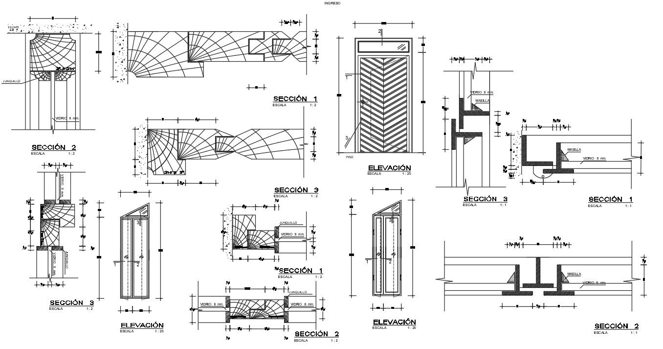 Constructive Details In AutoCAD File which shows window and door section detail, window frame, door frame, jonquil, glass detail with elevations and sections.