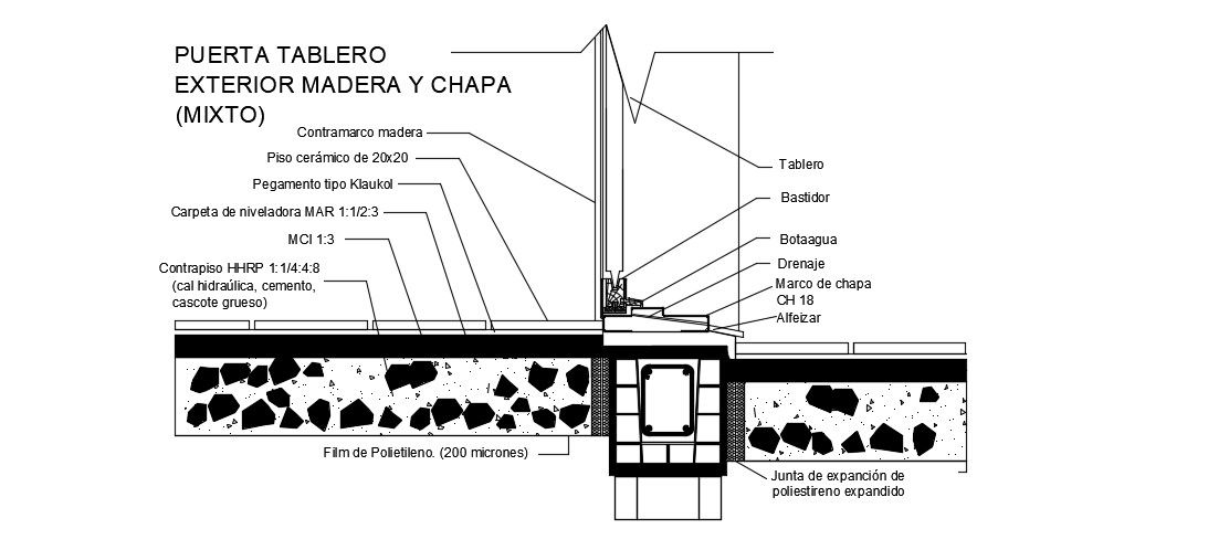 Wooden Door Detail In DWG File which shows Door panel, exterior Wooden, Section Cut Detail, Board, Expansion joint, expanded Detail.