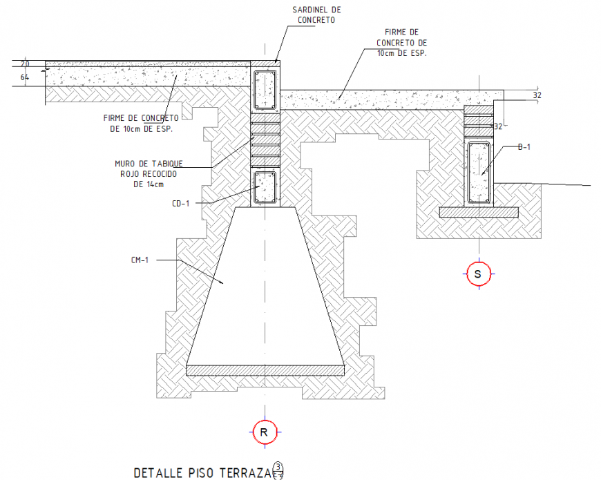 Errace foundation section plan layout file, centre line plan detail, dimension detail, naming detail, concrete mortar detail, reinforcement detail, bolt nut detail, column section detail, hatching detail, soil detail, etc.