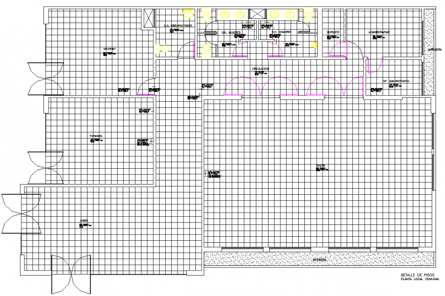 Salon flooring design autocad file, concrete mortar detail, furniture detail in door and window detail, single and double door detail, toilet detail in water closed and sink detail, leveling detail, administration detail, etc.