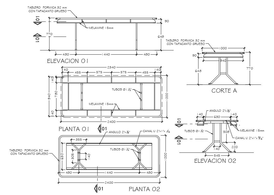 Table Detail In DWG File which shows glass detail, Formica board, melamine, angle details, tubes details, channel details with dimensions.