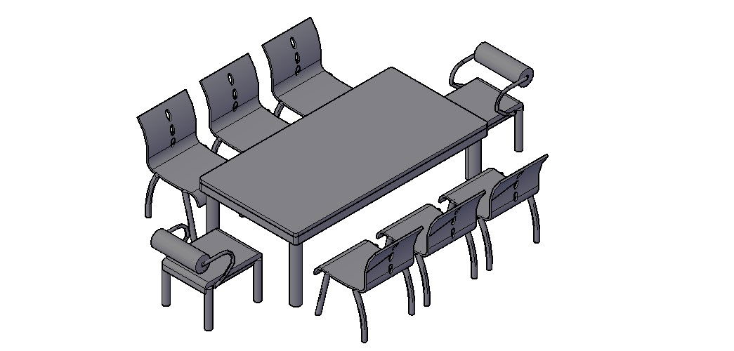 Dining Table 3D Model In DWG File which shows 3d drawing of a modern dining table with 8 chairs with an isometric view and hatching.