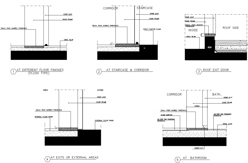 Threshold section plan detail dwg file, Staircase and corridor section detail, roof exit door section detail, bathroom section detail, exit and external area detail, different floor finishes detail, dimension detail, naming detail, soil detail, reinforcement detail, hatching detail, etc.