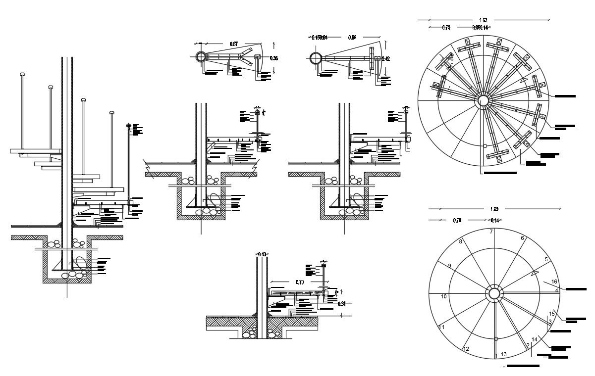 Spiral Staircase Details In DWG File which shows pine hand, wooden screw, steel bar, round iron, electrical welding details with dimensions.