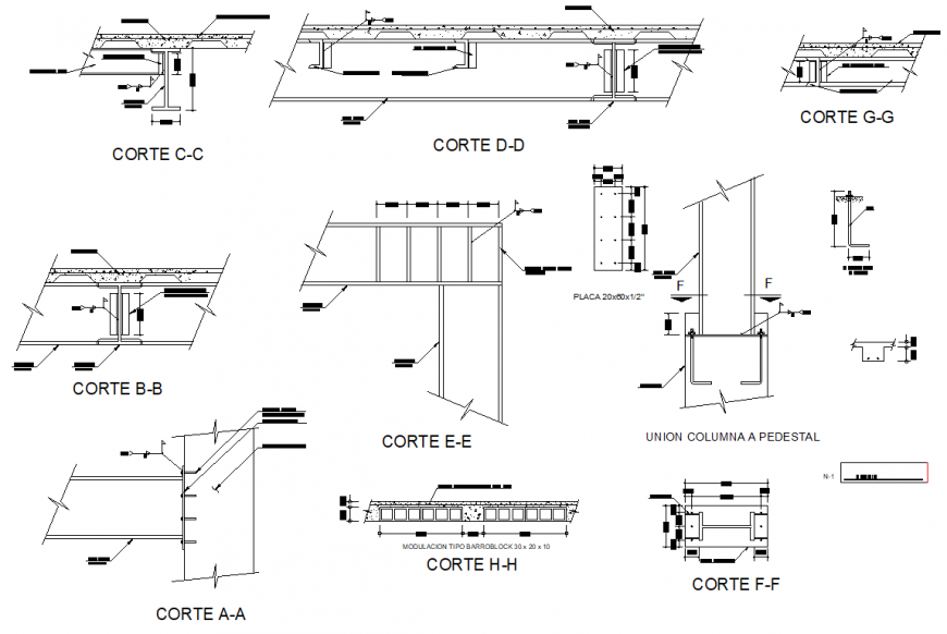 Section steel deck plan autocad file, dimension detail, naming detail, concrete mortar detail, section A-A’ detail, section B-B’ detail, section C-C’ detail, section D-D’ detail, section E-E’ detail, section F-F’ detail, section G-G’ detail, reinforcement detail, bolt nut detail, column pedestal section detail, etc.