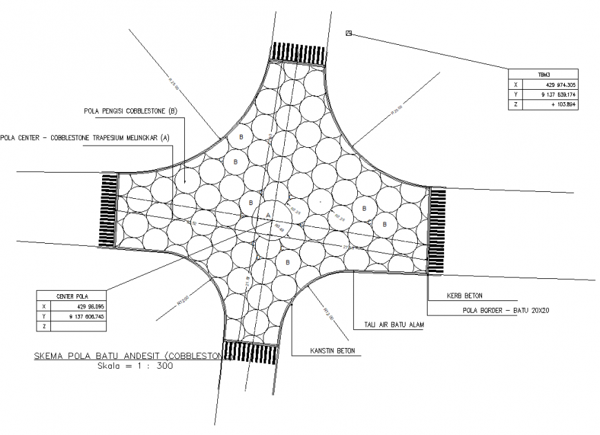 Cobble stone pattern plan layout file, dimension detail, naming detail, section lien detail, legend detail, scale 1:300 detail, stone detail, etc.