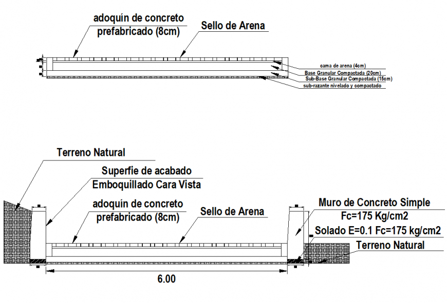Section paving stone autocad file, dimension detail, naming detail, specification detail, concrete mortar detail, Fc = 175 kg/cm2 detail, E = 0.1 detail, hatching detail, etc.
