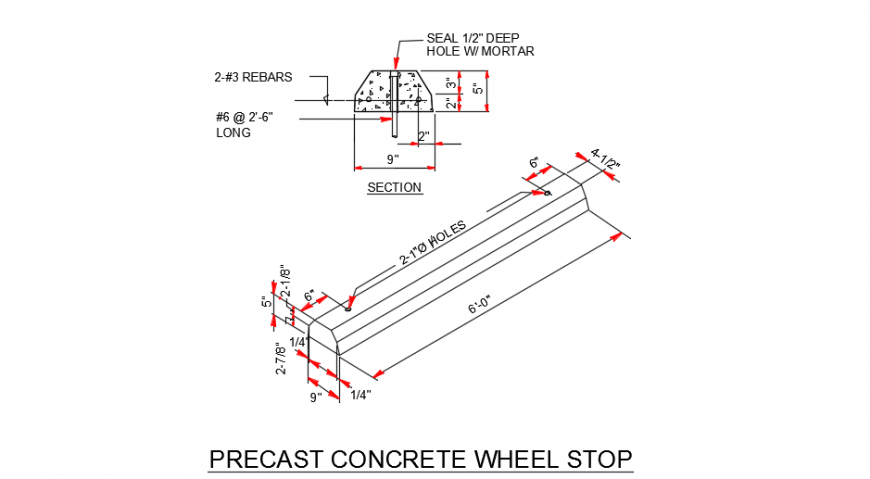 Precast concrete wheel stop sectional detail,Sectional details with text detailing, sectional details with measurement and text is shown