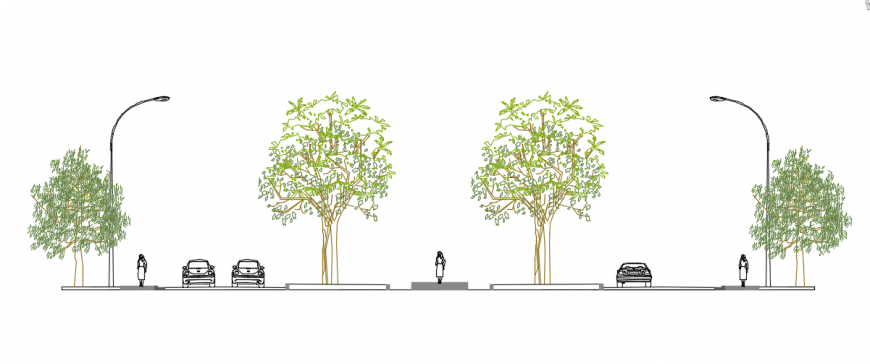 Road cross section with greenary,front sectional deatiling of a road, with greenary detailing in 2d
