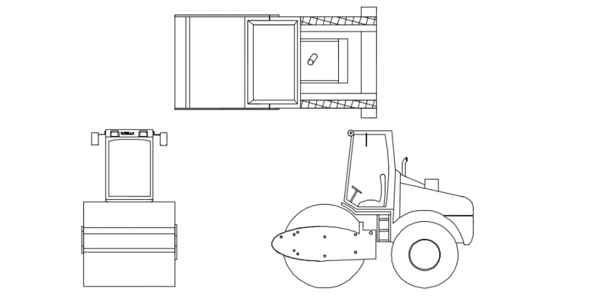 Steam roller machine and vehicle,here there is 2d detailing of a steam roller , front view model and top view model detailing also