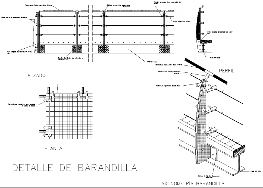 Steel railing plan detail dwg file. The elevation plan with constructive plans, sections, detailing, etc.,