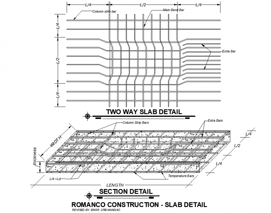 Detail of slab plan dwg file. The top view plan with detailing of width, length, column strip bars, etc., The elevation plan with detailing of two way slab detail, etc.,