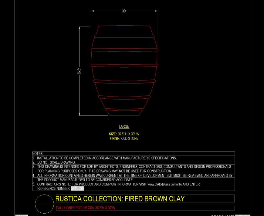 Tall honey pot in dwg file. detail drawing of tall honey pot with grooving, old stone finish, and with dimensions details.