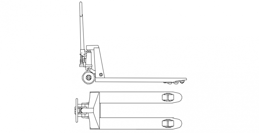 Pallet truck plan and elevation model, side view and front elevation details of a truck pallet is shown with measurements details are shown