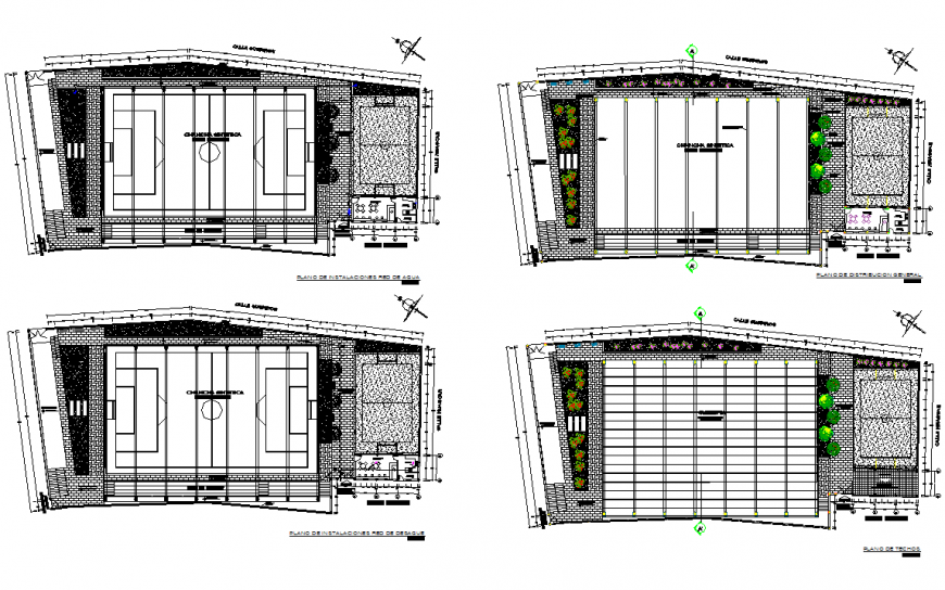 Synthetic field planning detail dwg file, north direction detail, section lien detail, dimension detail, naming detail, landscaping detail in tree and plant detail, concrete mortar detail, brick wall detail, furniture detail in door and window detail, etc.