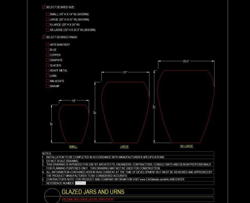 Paloma large jar in dwg file. detail drawing of paloma large jar ,three different style pot with front elevation, with dimensions and notes.