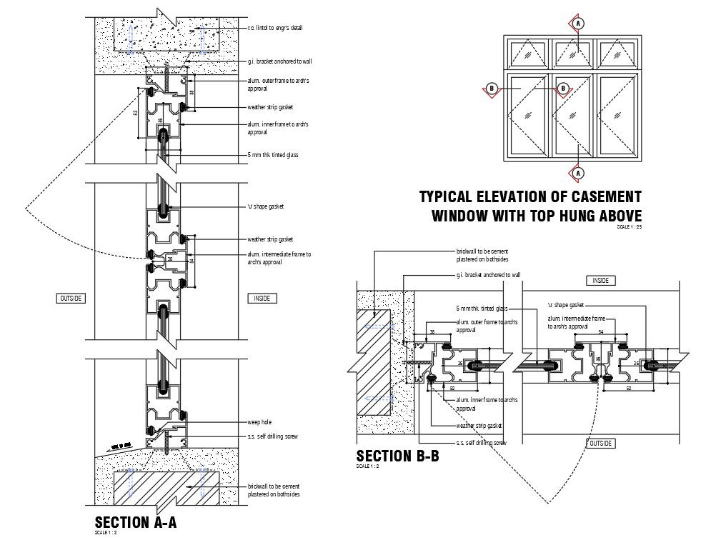 Typical Elevation Of Casement Window With Top Hung Above. Section And Elevation design.