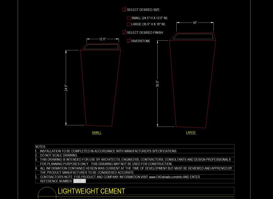 Light weight cement in dwg file. detail drawing of pot, with front elevation, small and large size pots, dimensions details, using river stone as a material.
